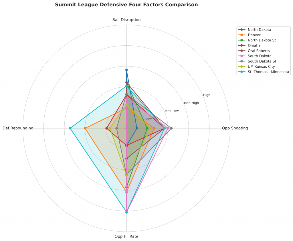 Figure 3: Defensive Four Factors comparison across Summit League teams. The radar chart shows each team’s opponent shooting defense (Opp eFG%), ball disruption (forcing TOV%), defensive rebounding (DREB%), and opponent free throw prevention (Opp FT Rate).