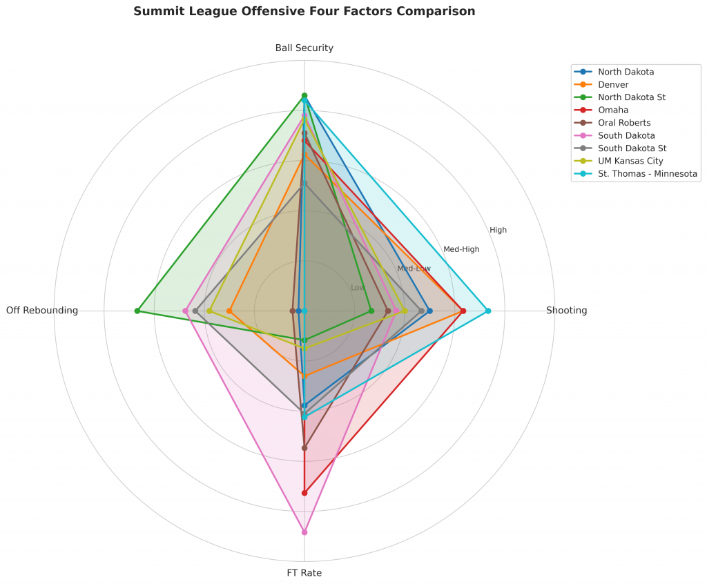 Figure 2: Offensive Four Factors comparison across Summit League teams. The radar chart shows each team’s shooting efficiency (eFG%), ball security (TOV%), offensive rebounding (OREB%), and free throw generation (FT Rate).