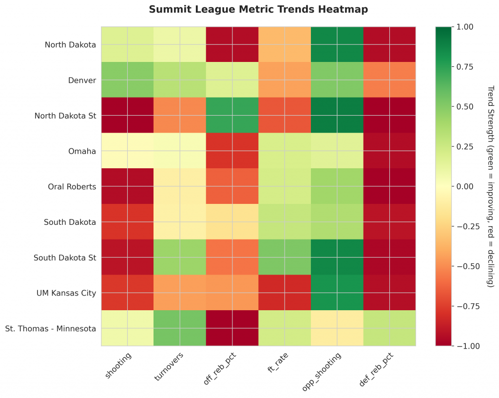 As Summit League teams continue their season, the MACD trending indicators will help identify which teams are genuinely improving versus those riding unsustainable momentum. Check back next week for updated analysis.