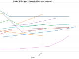 - Off Reb Pct (Offensive Rebounding): Currently ranked 326 of 365 in D1. Trending down strongly.