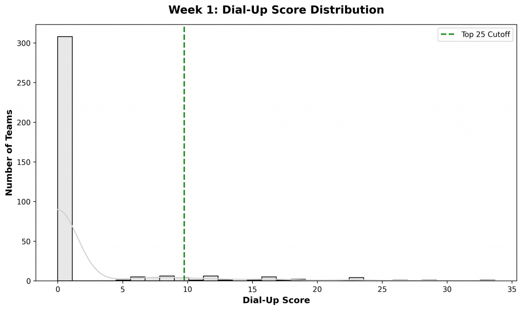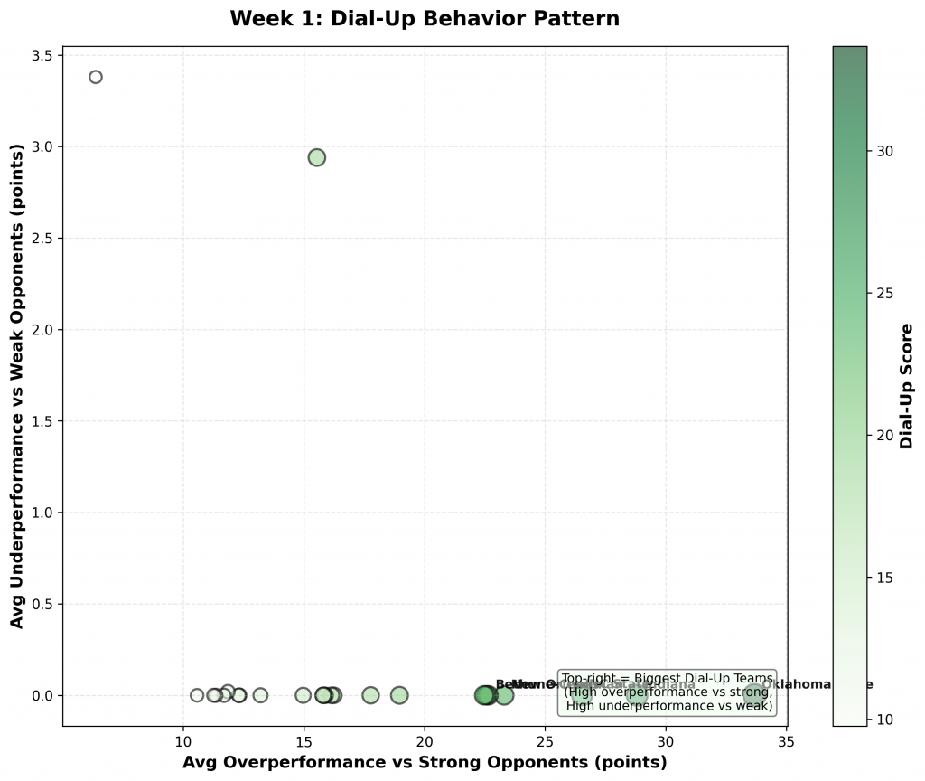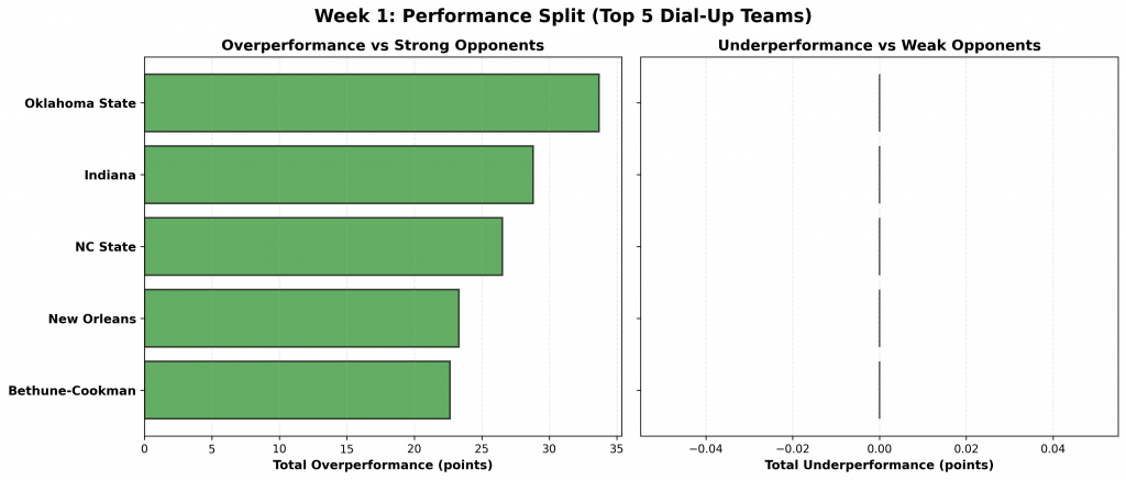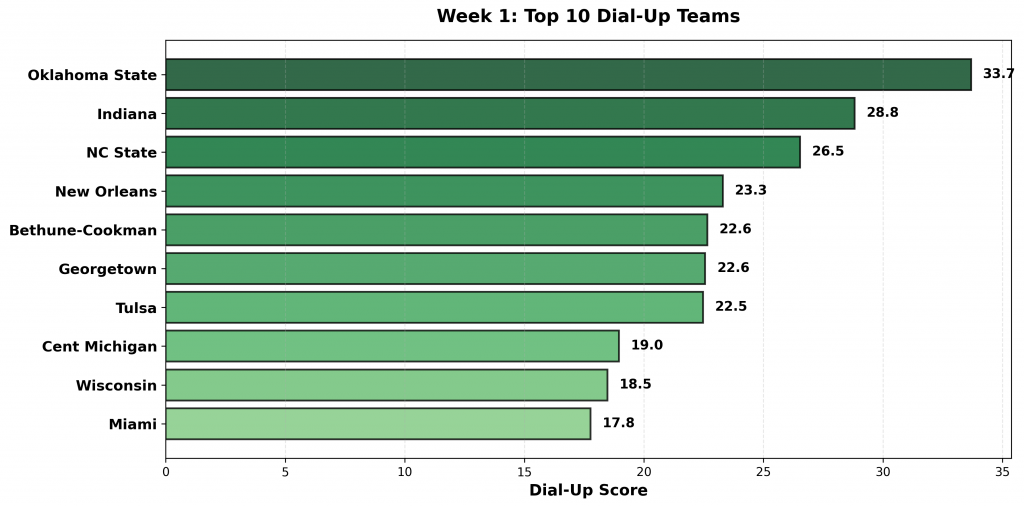 Figure 1: Top 10 teams with the highest Dial-Up scores in Week 1. Scores reflect the combination of overperformance against strong opponents and underperformance against weak ones.