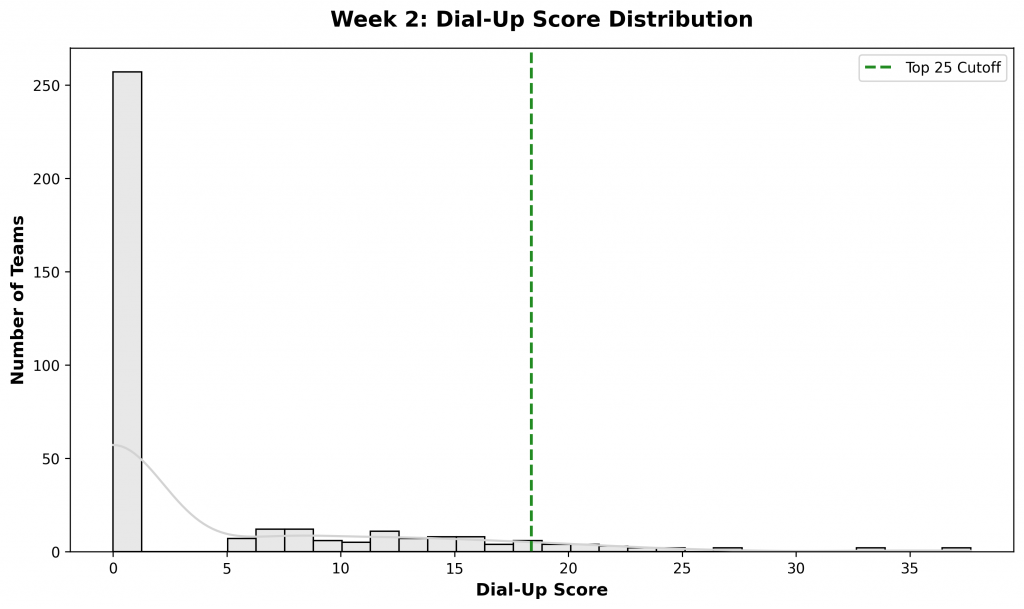 Figure 4: Distribution of Dial-Up scores across all Division I teams. The top 25 teams (highlighted in green) represent those with the most extreme performance splits based on opponent quality.