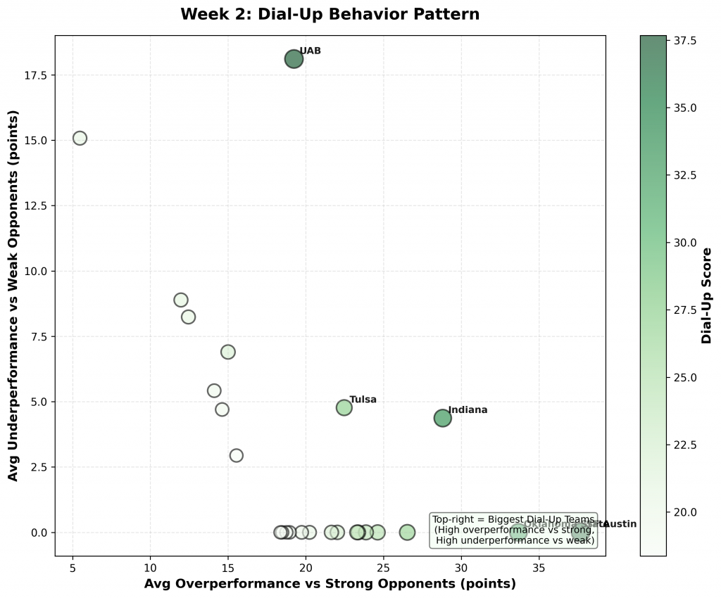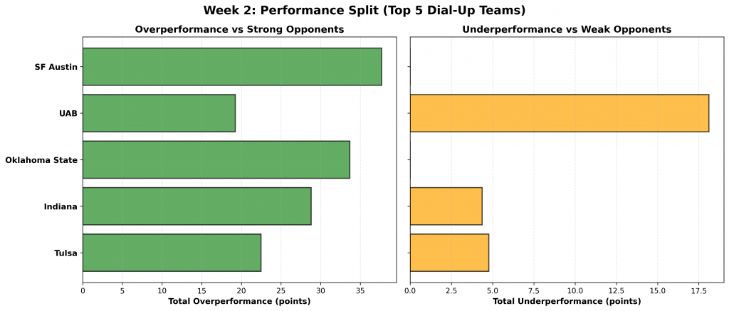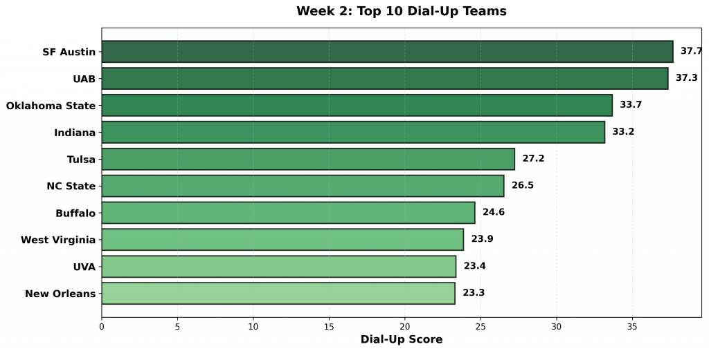 Figure 1: Top 10 teams with the highest Dial-Up scores in Week 2. Scores reflect the combination of overperformance against strong opponents and underperformance against weak ones.