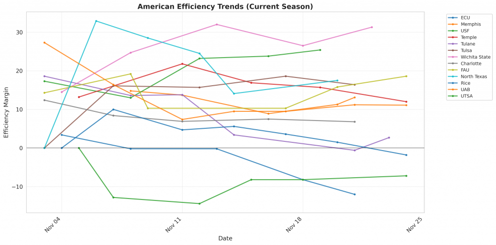 Figure 1: Efficiency margin trends for American teams throughout the season. Teams trending upward show improving performance, while downward trends indicate struggles.