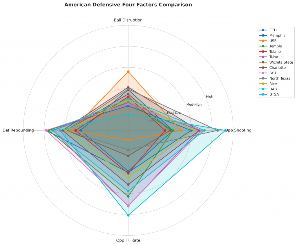 Figure 3: Defensive Four Factors comparison across American teams. The radar chart shows each team’s opponent shooting defense (Opp eFG%), ball disruption (forcing TOV%), defensive rebounding (DREB%), and opponent free throw prevention (Opp FT Rate).