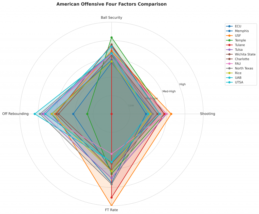 Figure 2: Offensive Four Factors comparison across American teams. The radar chart shows each team’s shooting efficiency (eFG%), ball security (TOV%), offensive rebounding (OREB%), and free throw generation (FT Rate).