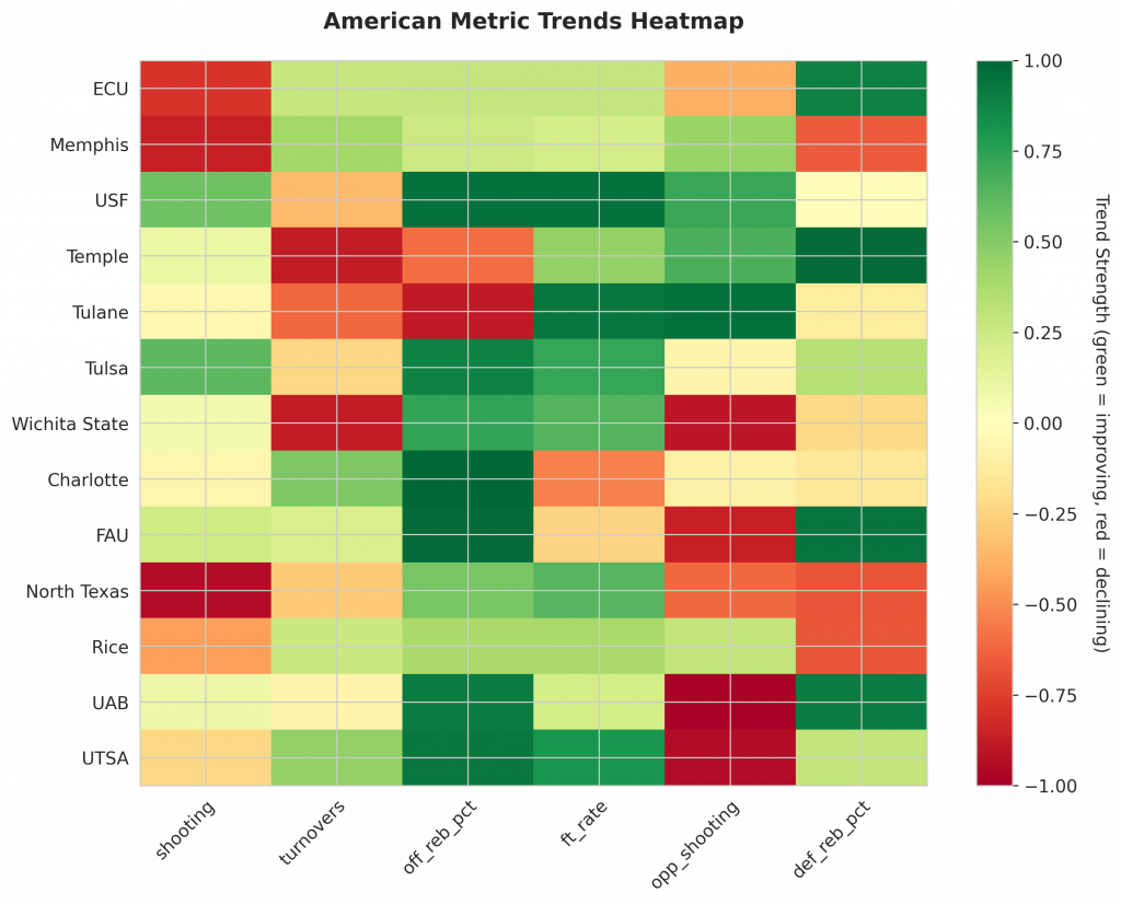 - Trending Down (Efficiency): ECU, Memphis, Tulane, Charlotte, North Texas
