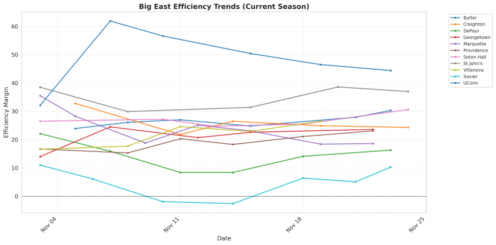 Figure 1: Efficiency margin trends for Big East teams throughout the season. Teams trending upward show improving performance, while downward trends indicate struggles.