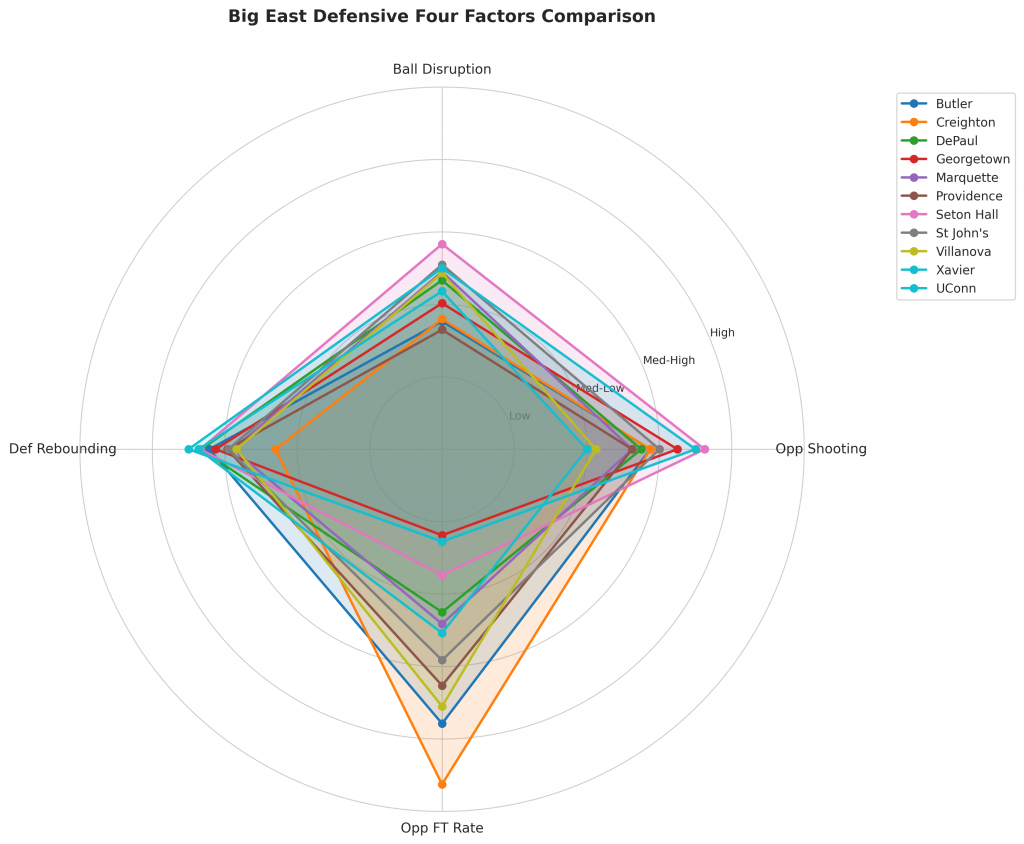Figure 3: Defensive Four Factors comparison across Big East teams. The radar chart shows each team’s opponent shooting defense (Opp eFG%), ball disruption (forcing TOV%), defensive rebounding (DREB%), and opponent free throw prevention (Opp FT Rate).