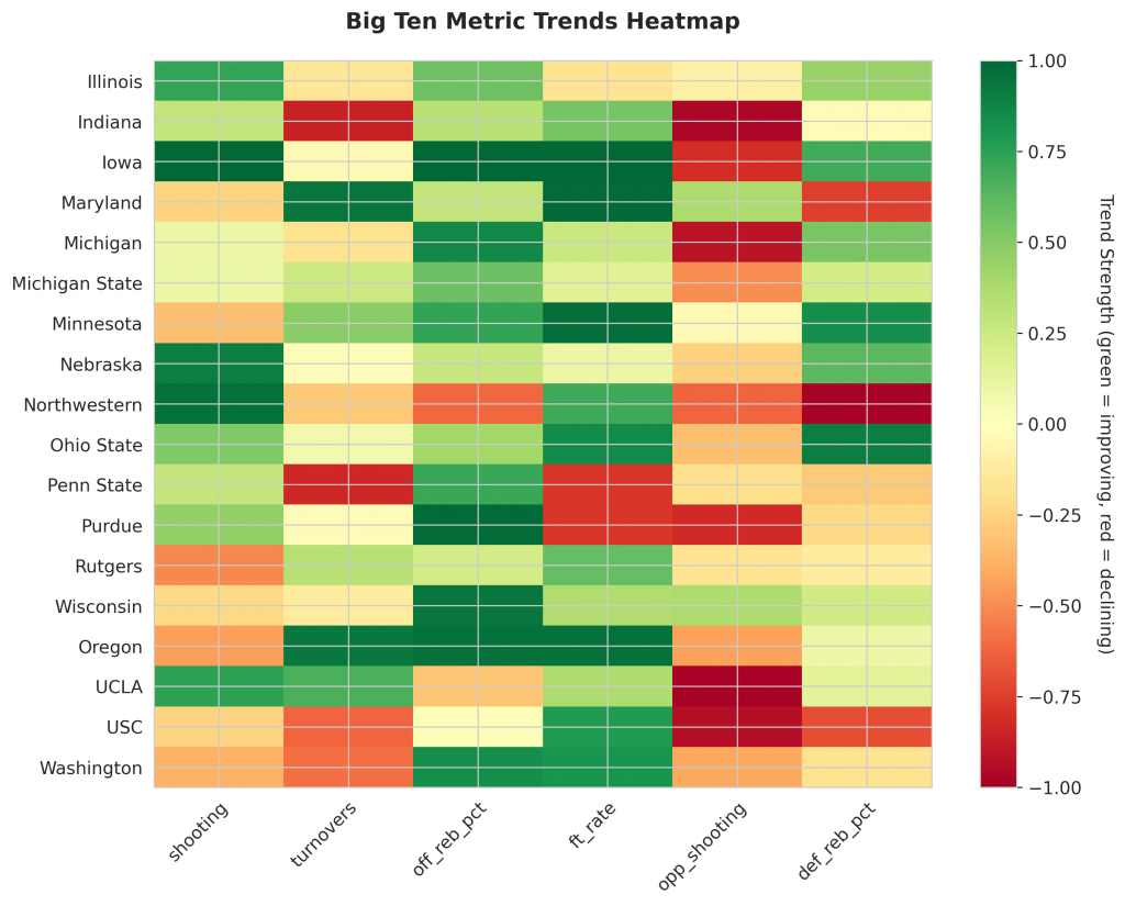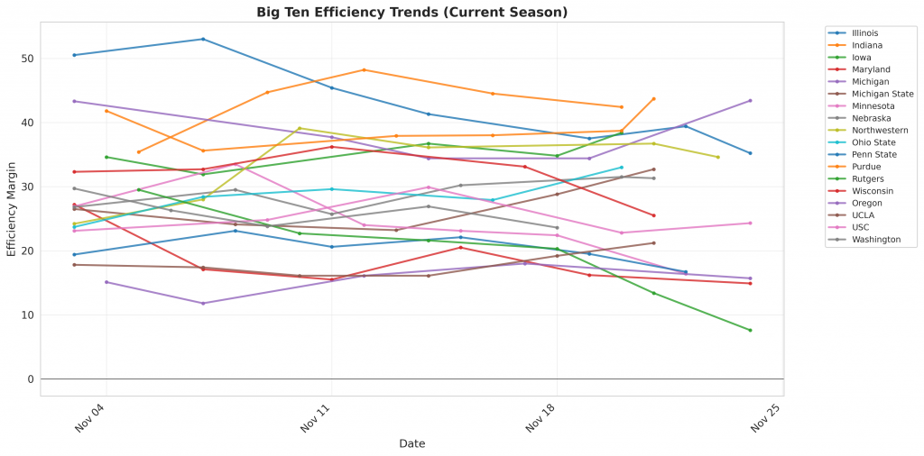 Figure 1: Efficiency margin trends for Big Ten teams throughout the season. Teams trending upward show improving performance, while downward trends indicate struggles.