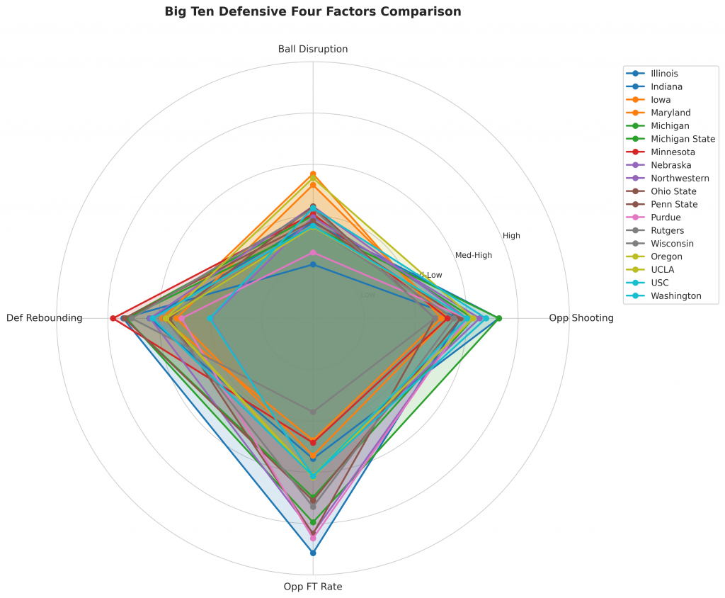 Figure 3: Defensive Four Factors comparison across Big Ten teams. The radar chart shows each team’s opponent shooting defense (Opp eFG%), ball disruption (forcing TOV%), defensive rebounding (DREB%), and opponent free throw prevention (Opp FT Rate).