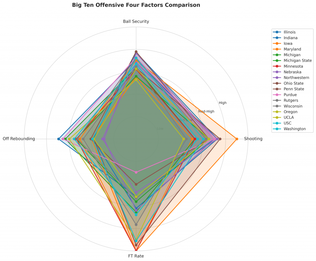 Figure 2: Offensive Four Factors comparison across Big Ten teams. The radar chart shows each team’s shooting efficiency (eFG%), ball security (TOV%), offensive rebounding (OREB%), and free throw generation (FT Rate).