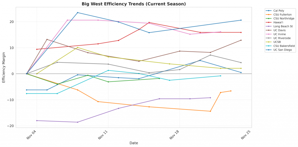Figure 1: Efficiency margin trends for Big West teams throughout the season. Teams trending upward show improving performance, while downward trends indicate struggles.