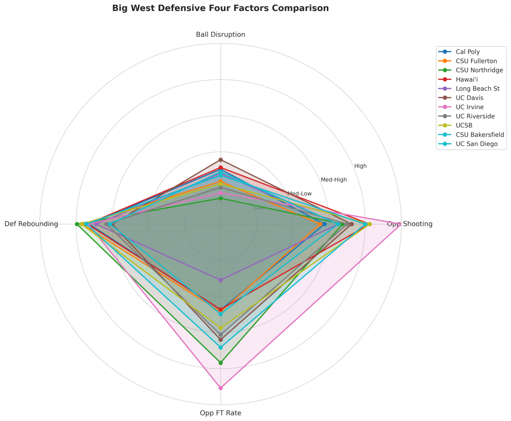 Figure 3: Defensive Four Factors comparison across Big West teams. The radar chart shows each team’s opponent shooting defense (Opp eFG%), ball disruption (forcing TOV%), defensive rebounding (DREB%), and opponent free throw prevention (Opp FT Rate).