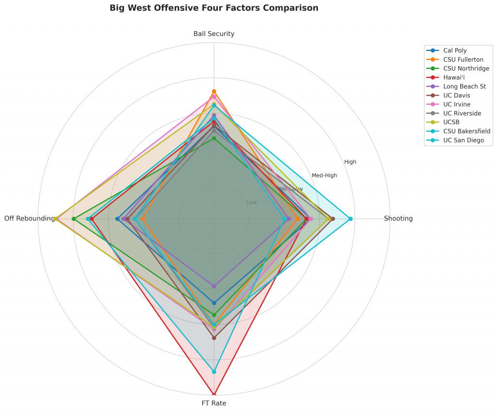 Figure 2: Offensive Four Factors comparison across Big West teams. The radar chart shows each team’s shooting efficiency (eFG%), ball security (TOV%), offensive rebounding (OREB%), and free throw generation (FT Rate).
