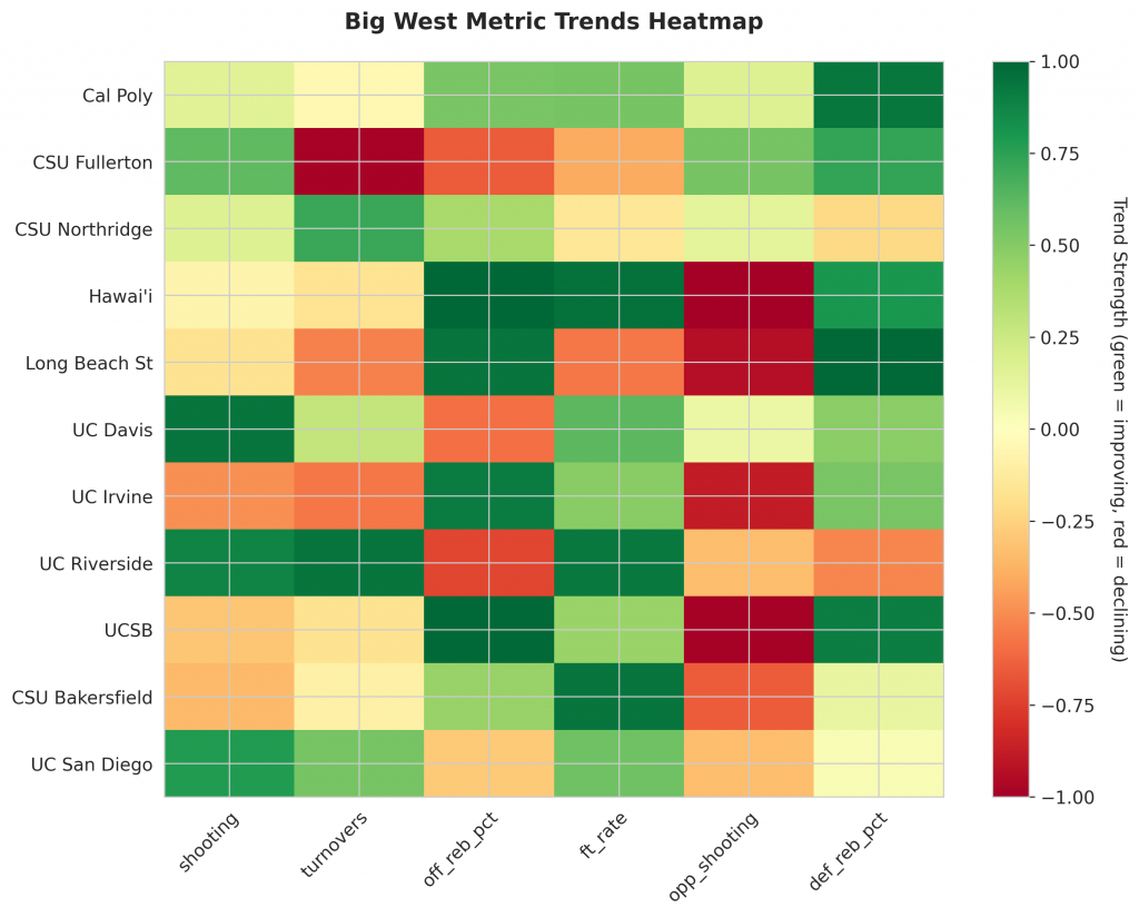 As Big West teams continue their season, the MACD trending indicators will help identify which teams are genuinely improving versus those riding unsustainable momentum. Check back next week for updated analysis.