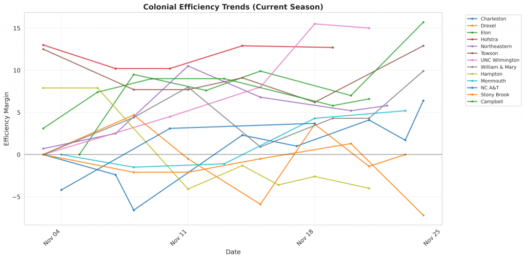 Figure 1: Efficiency margin trends for Colonial teams throughout the season. Teams trending upward show improving performance, while downward trends indicate struggles.