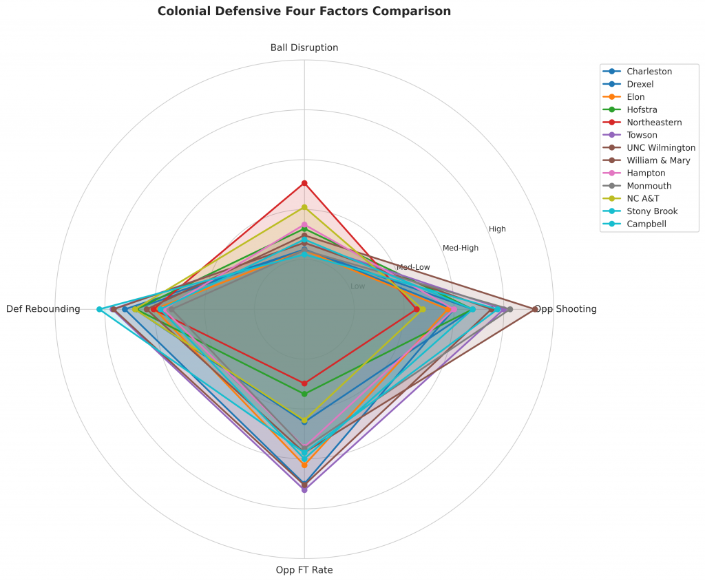 Figure 3: Defensive Four Factors comparison across Colonial teams. The radar chart shows each team’s opponent shooting defense (Opp eFG%), ball disruption (forcing TOV%), defensive rebounding (DREB%), and opponent free throw prevention (Opp FT Rate).