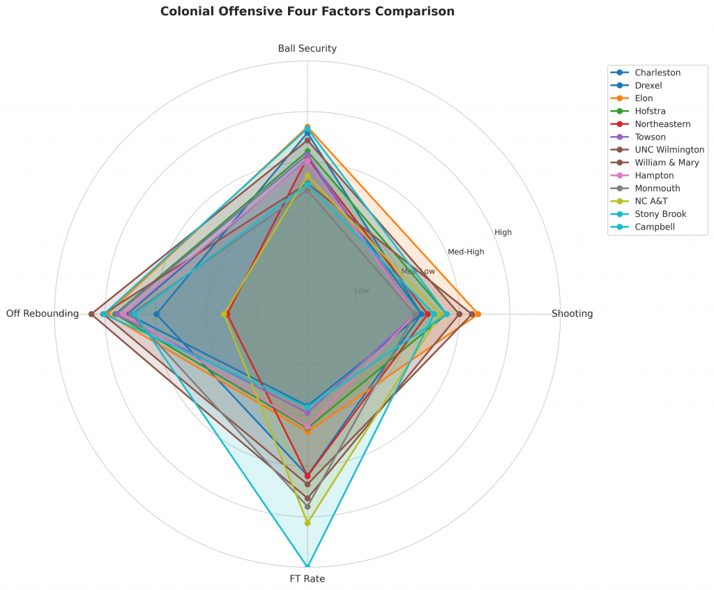 Figure 2: Offensive Four Factors comparison across Colonial teams. The radar chart shows each team’s shooting efficiency (eFG%), ball security (TOV%), offensive rebounding (OREB%), and free throw generation (FT Rate).
