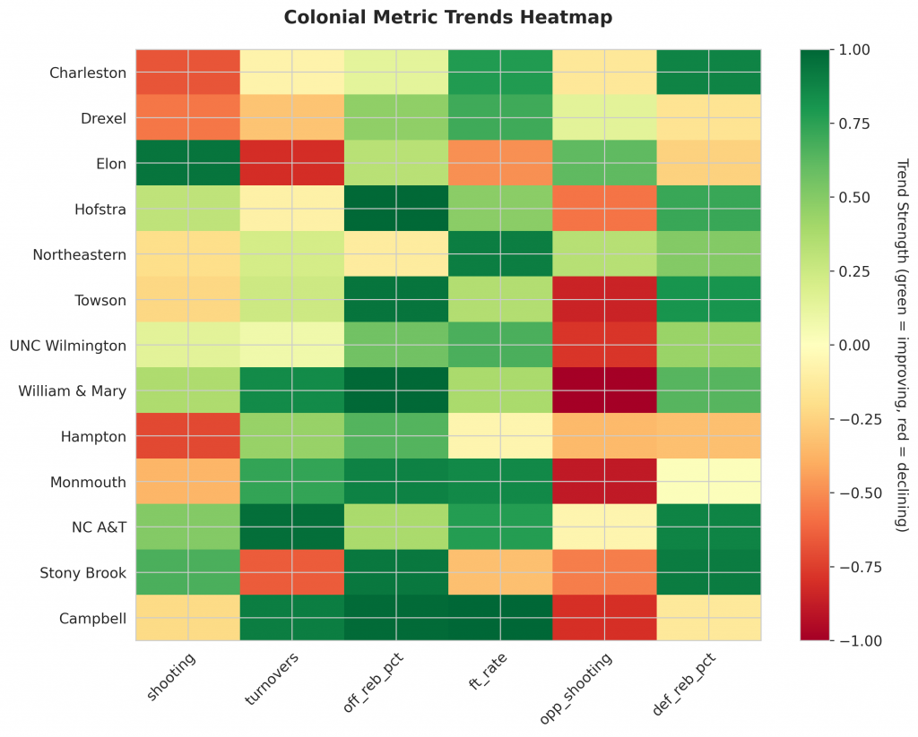 - Trending Down (Efficiency): Charleston, Drexel, Northeastern, Towson, Hampton