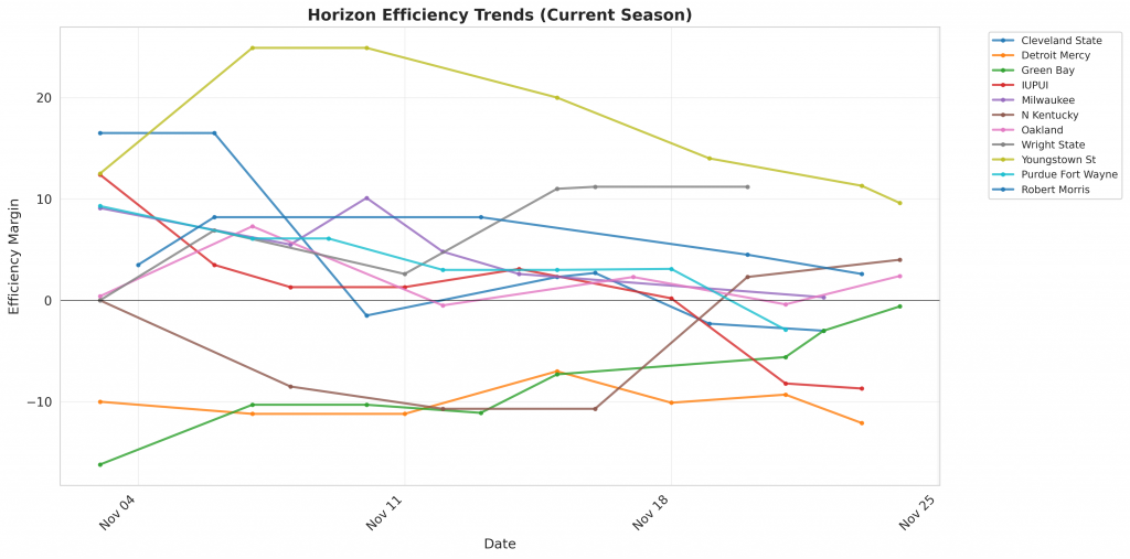 Figure 1: Efficiency margin trends for Horizon teams throughout the season. Teams trending upward show improving performance, while downward trends indicate struggles.