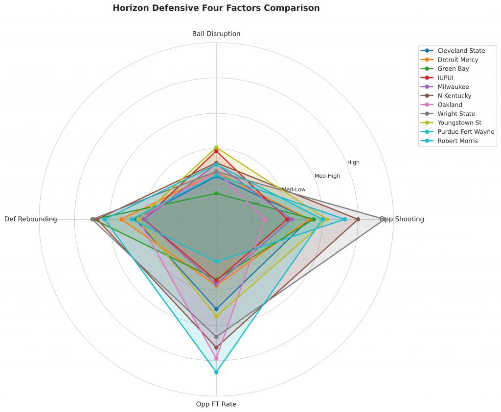 Figure 3: Defensive Four Factors comparison across Horizon teams. The radar chart shows each team’s opponent shooting defense (Opp eFG%), ball disruption (forcing TOV%), defensive rebounding (DREB%), and opponent free throw prevention (Opp FT Rate).