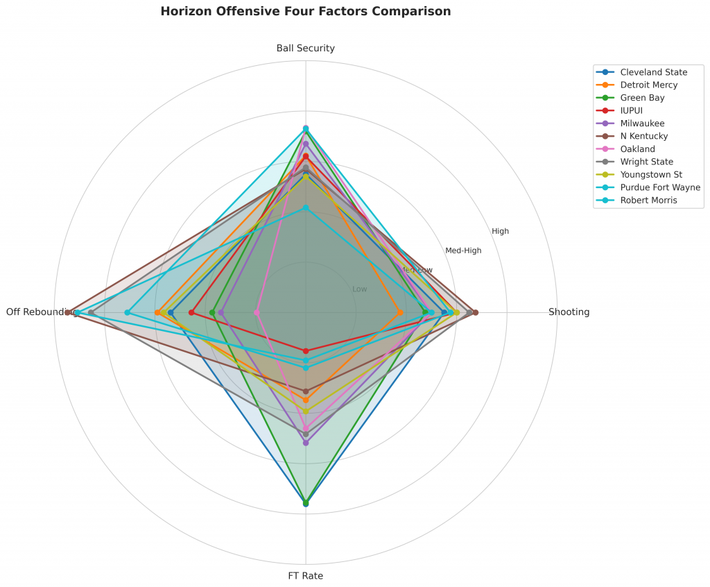 Figure 2: Offensive Four Factors comparison across Horizon teams. The radar chart shows each team’s shooting efficiency (eFG%), ball security (TOV%), offensive rebounding (OREB%), and free throw generation (FT Rate).