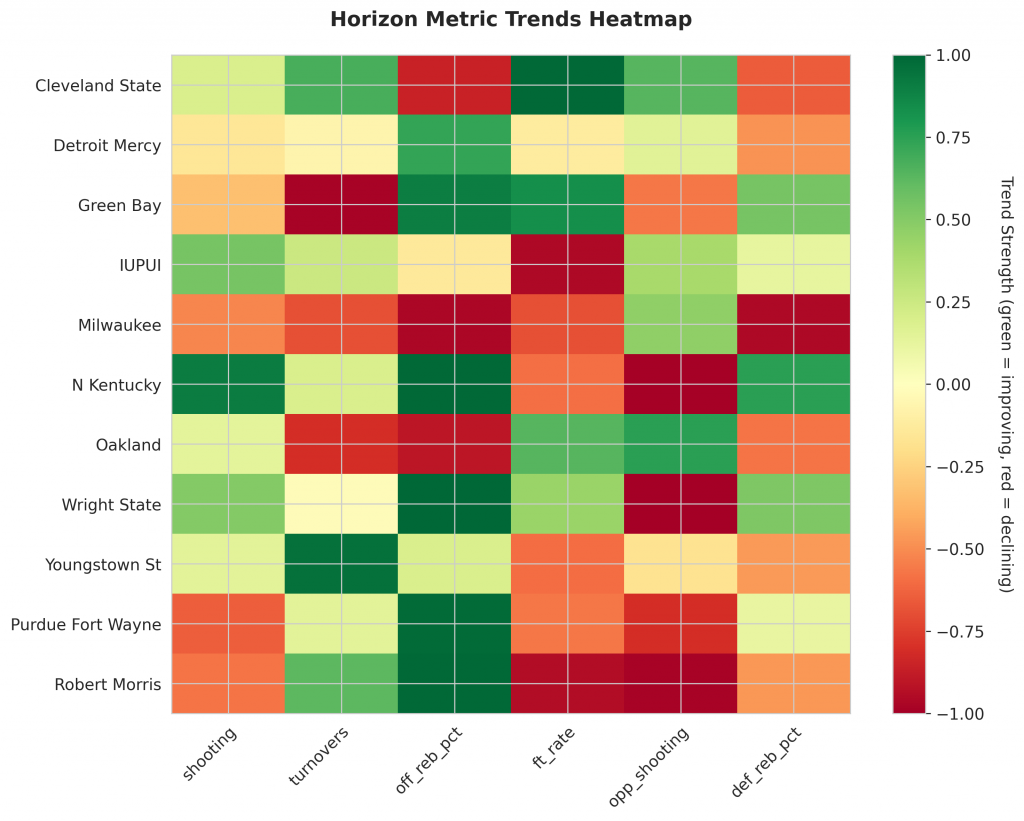 - Trending Down (Efficiency): Detroit Mercy, Green Bay, Milwaukee, Purdue Fort Wayne, Robert Morris