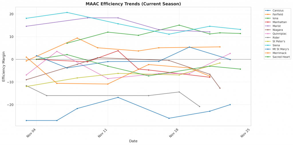 Figure 1: Efficiency margin trends for MAAC teams throughout the season. Teams trending upward show improving performance, while downward trends indicate struggles.