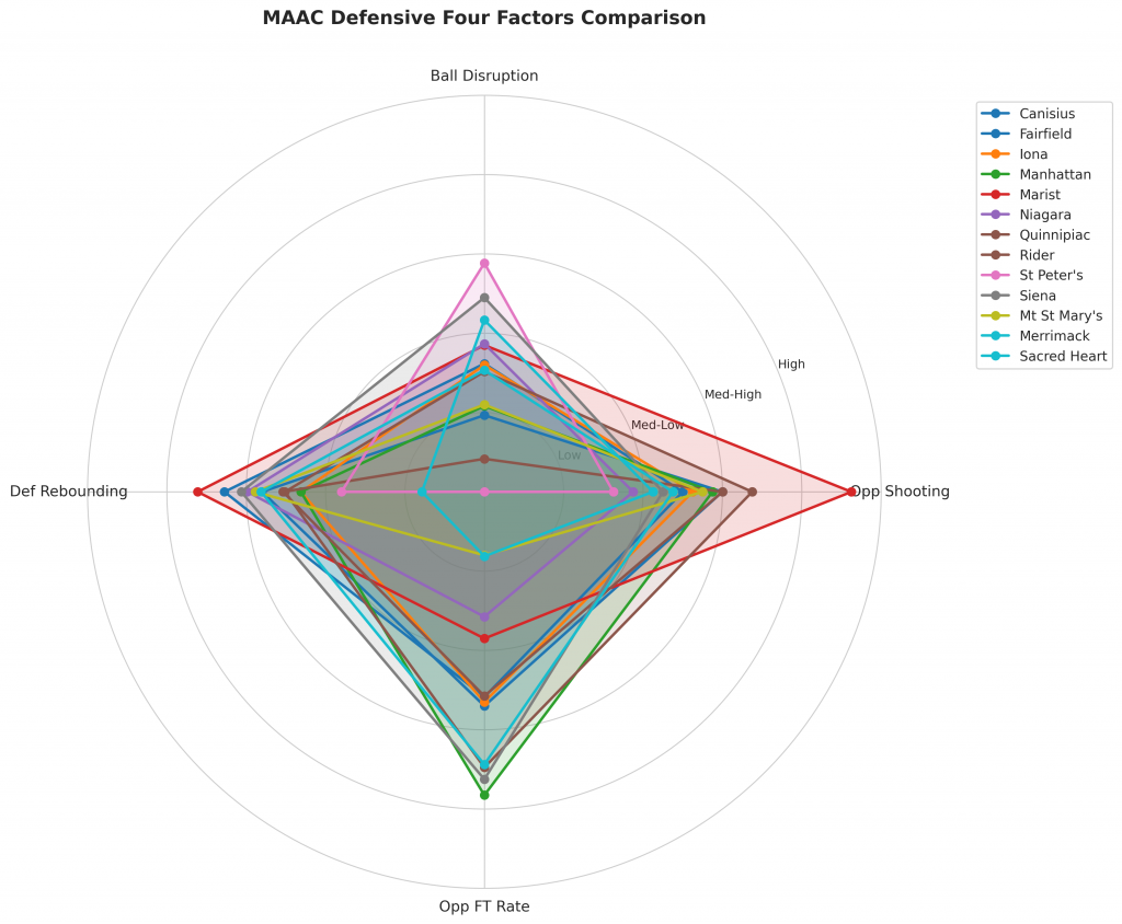 Figure 3: Defensive Four Factors comparison across MAAC teams. The radar chart shows each team’s opponent shooting defense (Opp eFG%), ball disruption (forcing TOV%), defensive rebounding (DREB%), and opponent free throw prevention (Opp FT Rate).