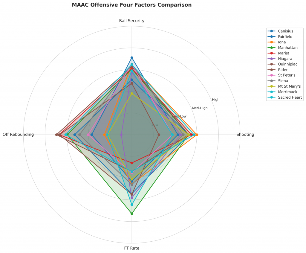 Figure 2: Offensive Four Factors comparison across MAAC teams. The radar chart shows each team’s shooting efficiency (eFG%), ball security (TOV%), offensive rebounding (OREB%), and free throw generation (FT Rate).