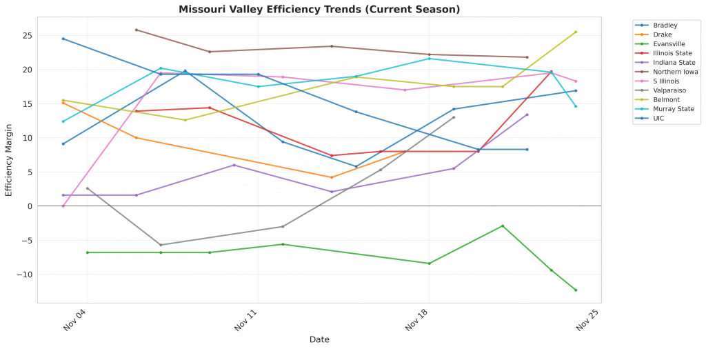 Figure 1: Efficiency margin trends for Missouri Valley teams throughout the season. Teams trending upward show improving performance, while downward trends indicate struggles.