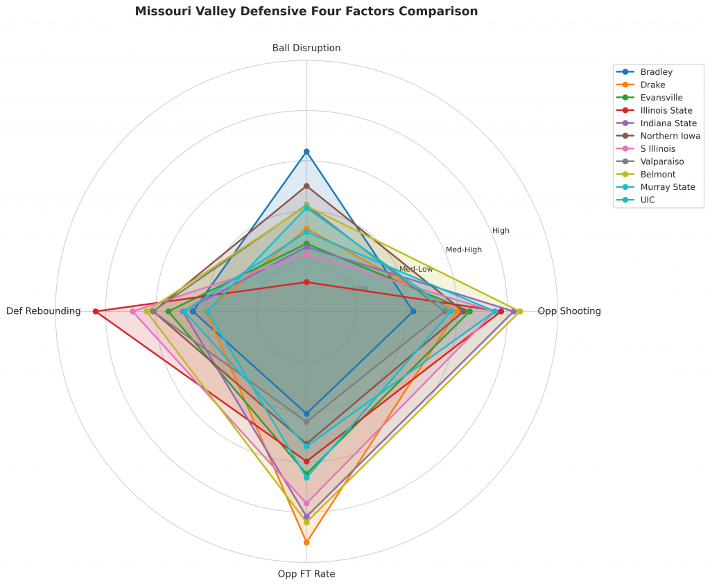 Figure 3: Defensive Four Factors comparison across Missouri Valley teams. The radar chart shows each team’s opponent shooting defense (Opp eFG%), ball disruption (forcing TOV%), defensive rebounding (DREB%), and opponent free throw prevention (Opp FT Rate).