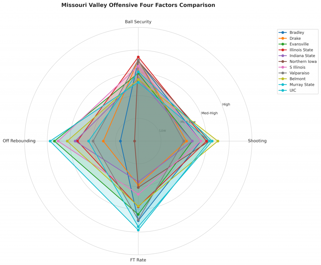 Figure 2: Offensive Four Factors comparison across Missouri Valley teams. The radar chart shows each team’s shooting efficiency (eFG%), ball security (TOV%), offensive rebounding (OREB%), and free throw generation (FT Rate).