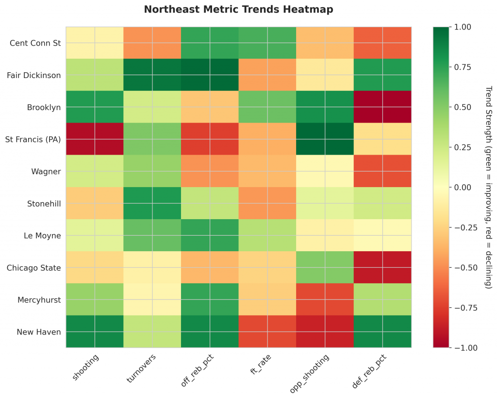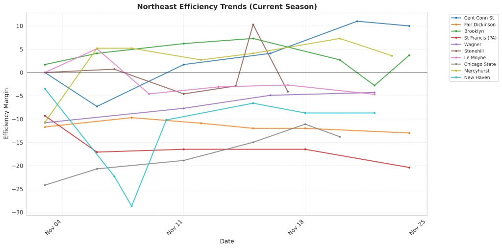 Figure 1: Efficiency margin trends for Northeast teams throughout the season. Teams trending upward show improving performance, while downward trends indicate struggles.