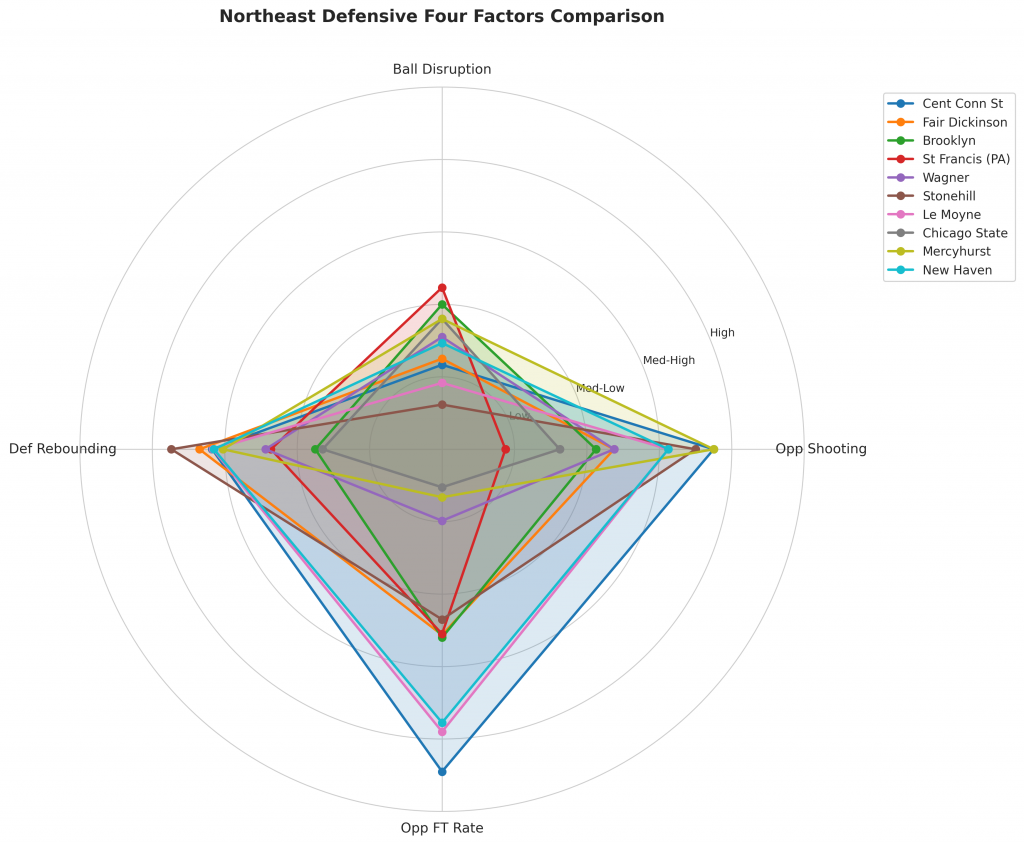 Figure 3: Defensive Four Factors comparison across Northeast teams. The radar chart shows each team’s opponent shooting defense (Opp eFG%), ball disruption (forcing TOV%), defensive rebounding (DREB%), and opponent free throw prevention (Opp FT Rate).