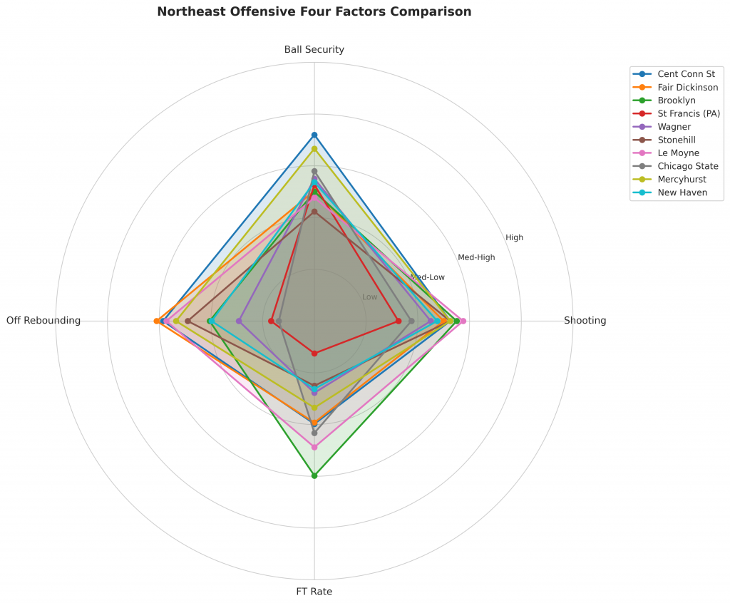 Figure 2: Offensive Four Factors comparison across Northeast teams. The radar chart shows each team’s shooting efficiency (eFG%), ball security (TOV%), offensive rebounding (OREB%), and free throw generation (FT Rate).