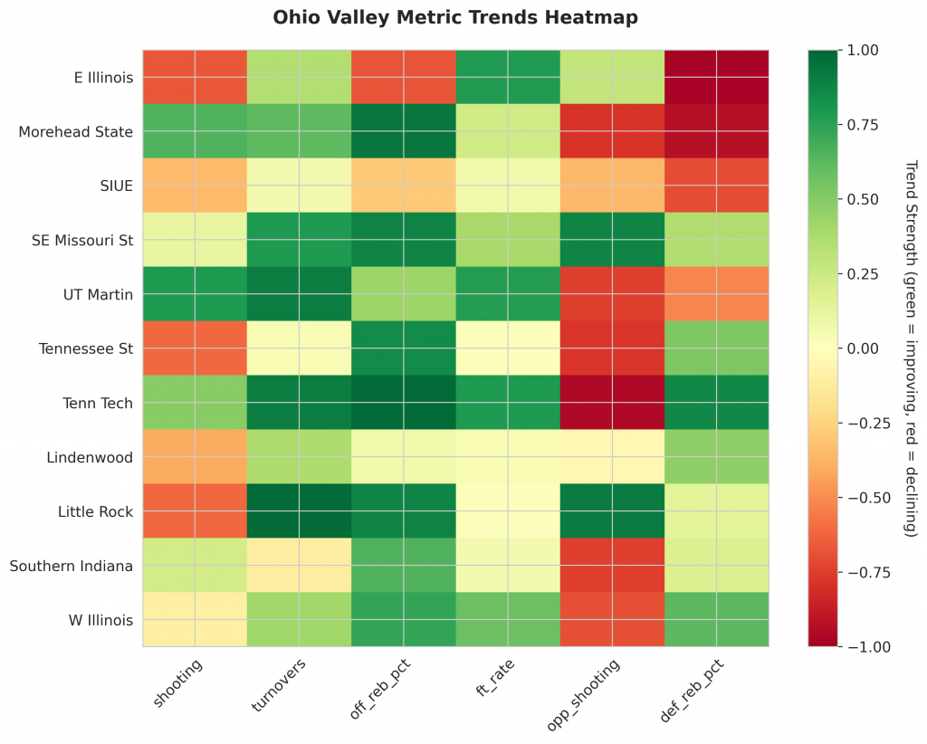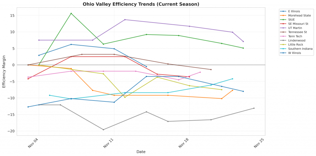Figure 1: Efficiency margin trends for Ohio Valley teams throughout the season. Teams trending upward show improving performance, while downward trends indicate struggles.