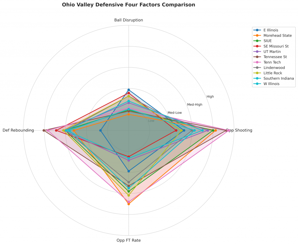 Figure 3: Defensive Four Factors comparison across Ohio Valley teams. The radar chart shows each team’s opponent shooting defense (Opp eFG%), ball disruption (forcing TOV%), defensive rebounding (DREB%), and opponent free throw prevention (Opp FT Rate).
