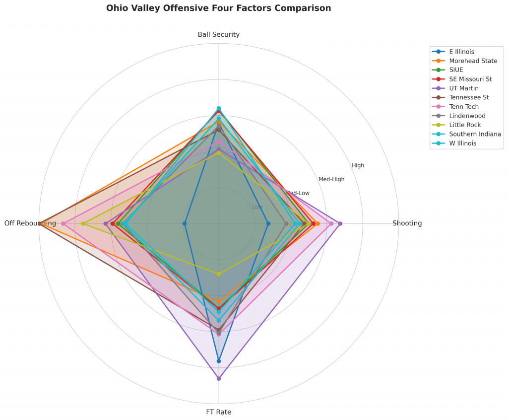 Figure 2: Offensive Four Factors comparison across Ohio Valley teams. The radar chart shows each team’s shooting efficiency (eFG%), ball security (TOV%), offensive rebounding (OREB%), and free throw generation (FT Rate).