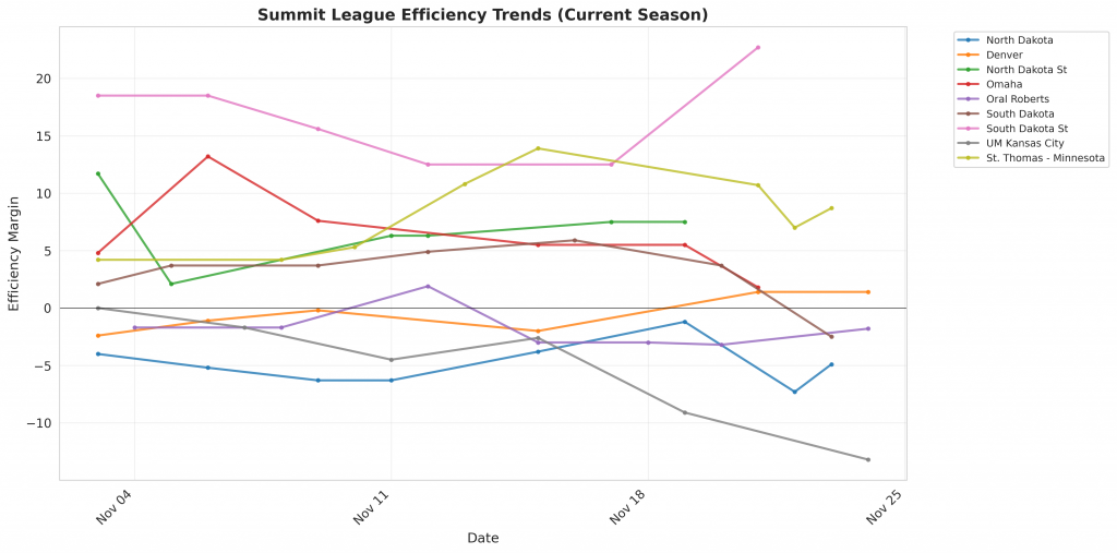 Figure 1: Efficiency margin trends for Summit League teams throughout the season. Teams trending upward show improving performance, while downward trends indicate struggles.