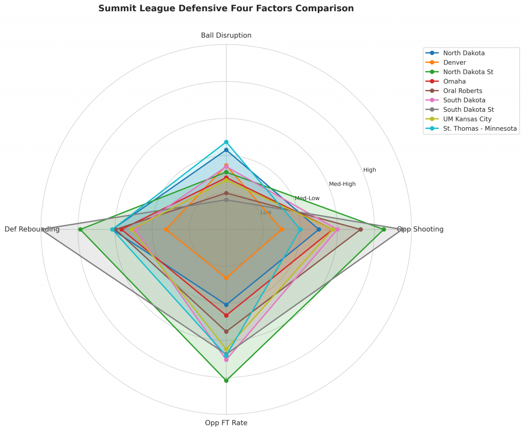 Figure 3: Defensive Four Factors comparison across Summit League teams. The radar chart shows each team’s opponent shooting defense (Opp eFG%), ball disruption (forcing TOV%), defensive rebounding (DREB%), and opponent free throw prevention (Opp FT Rate).