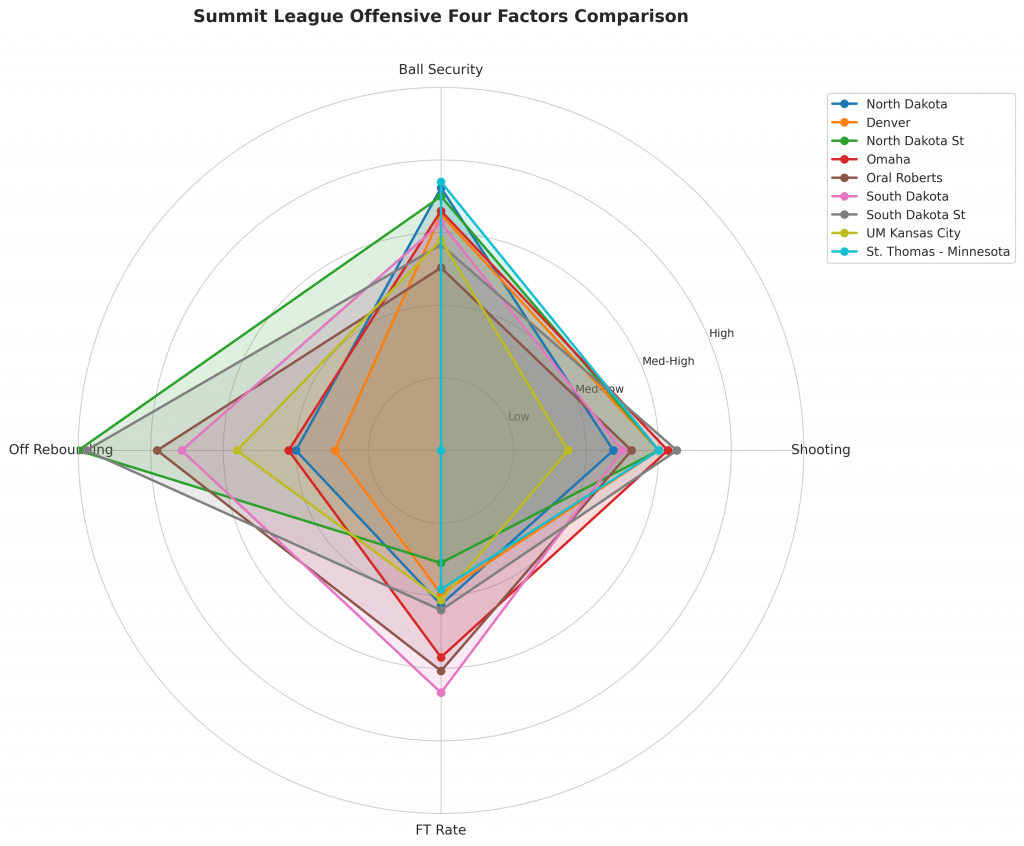 Figure 2: Offensive Four Factors comparison across Summit League teams. The radar chart shows each team’s shooting efficiency (eFG%), ball security (TOV%), offensive rebounding (OREB%), and free throw generation (FT Rate).