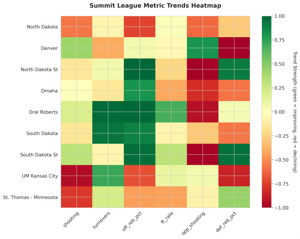 As Summit League teams continue their season, the MACD trending indicators will help identify which teams are genuinely improving versus those riding unsustainable momentum. Check back next week for updated analysis.