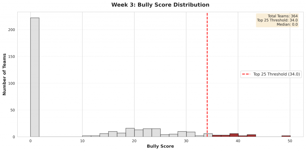 Figure 4: Distribution of bully scores across all Division I teams. The top 25 bullies (highlighted in red) represent teams whose efficiency metrics are most inflated by their performance patterns.