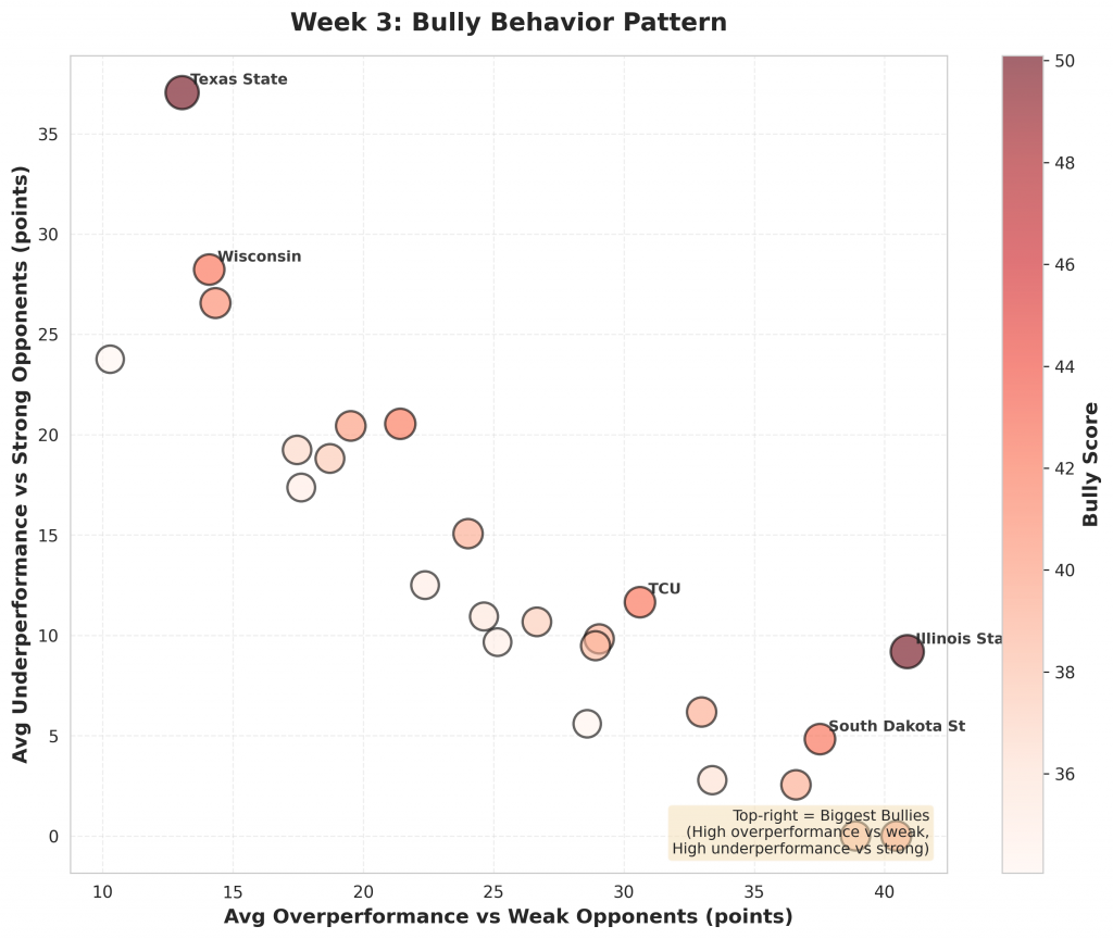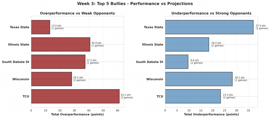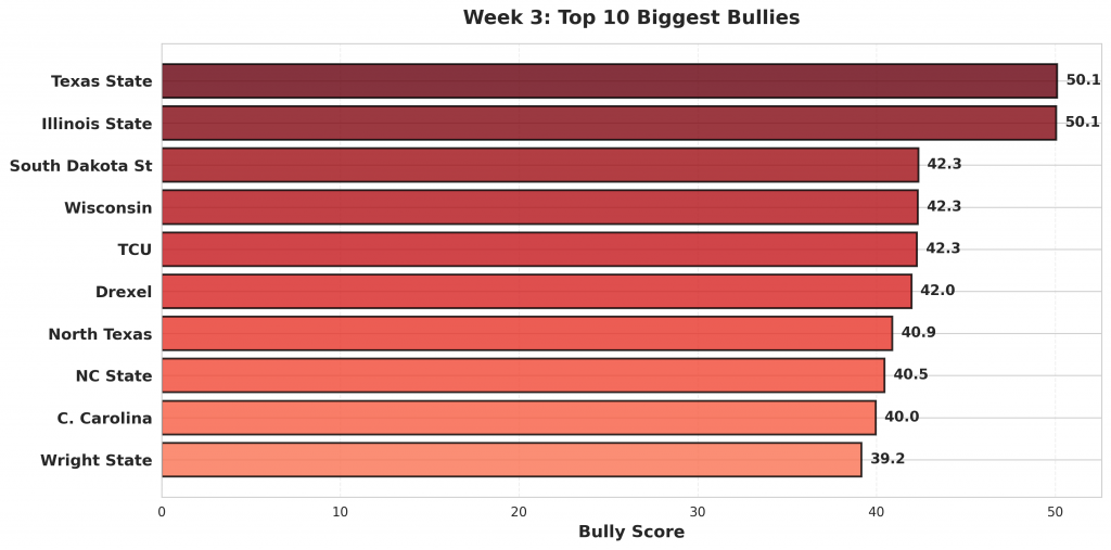 Figure 1: Top 10 teams with the highest bully scores in Week 3. Bully scores reflect the combination of overperformance against weak opponents and underperformance against quality competition.