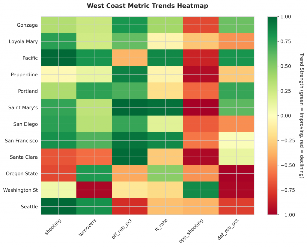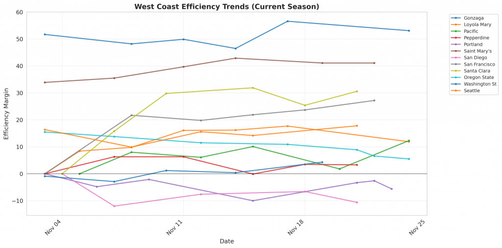 Figure 1: Efficiency margin trends for West Coast teams throughout the season. Teams trending upward show improving performance, while downward trends indicate struggles.