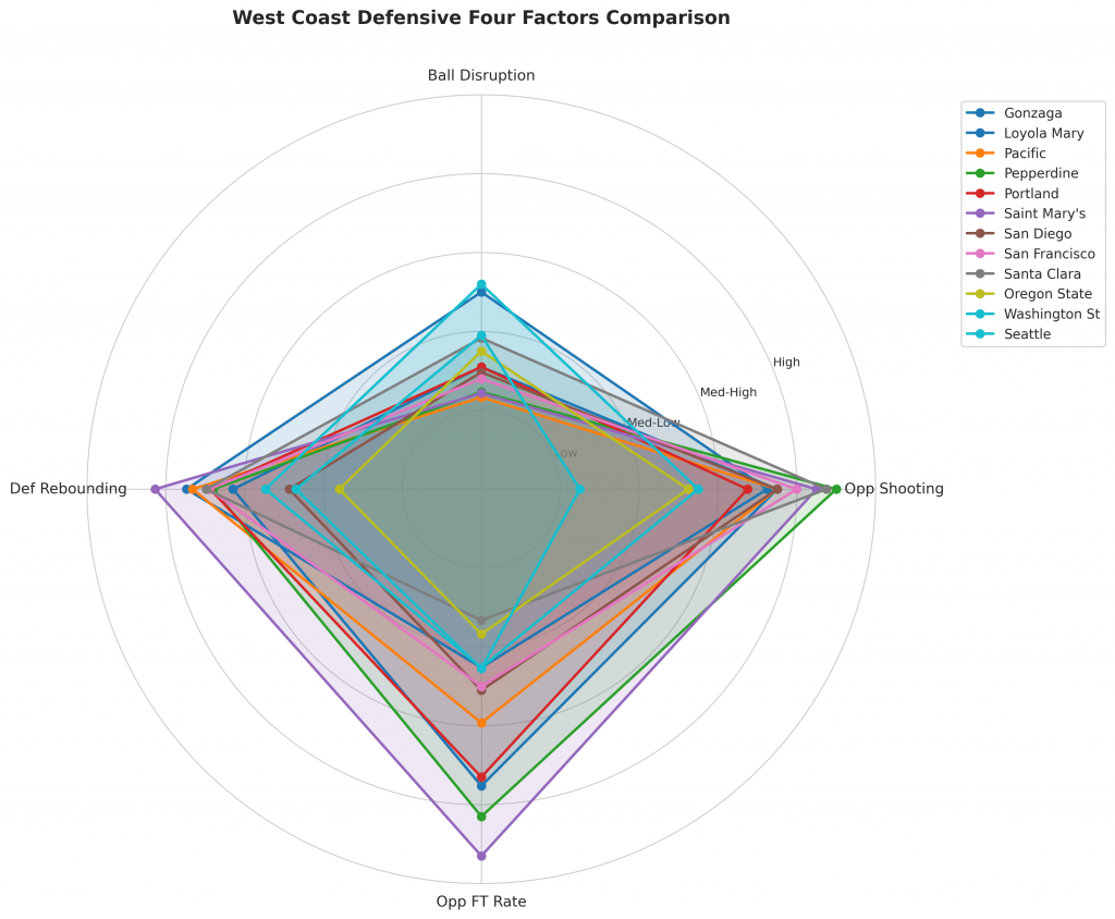 Figure 3: Defensive Four Factors comparison across West Coast teams. The radar chart shows each team’s opponent shooting defense (Opp eFG%), ball disruption (forcing TOV%), defensive rebounding (DREB%), and opponent free throw prevention (Opp FT Rate).