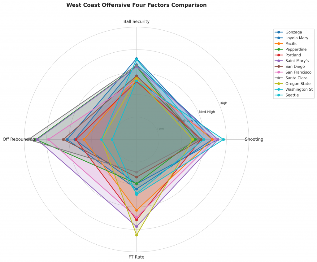 Figure 2: Offensive Four Factors comparison across West Coast teams. The radar chart shows each team’s shooting efficiency (eFG%), ball security (TOV%), offensive rebounding (OREB%), and free throw generation (FT Rate).