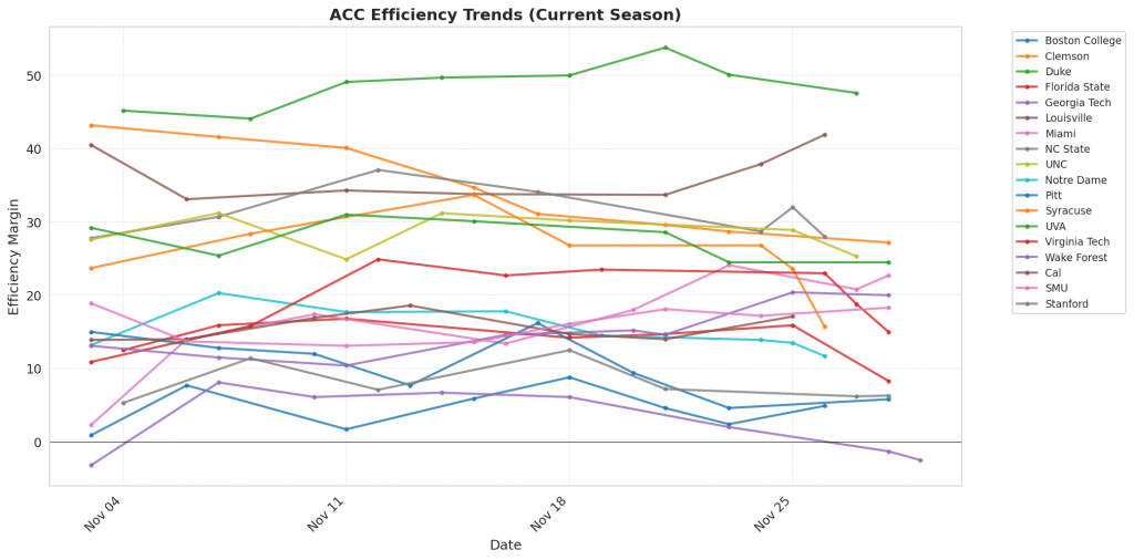 Figure 1: Efficiency margin trends for ACC teams throughout the season. Teams trending upward show improving performance, while downward trends indicate struggles.